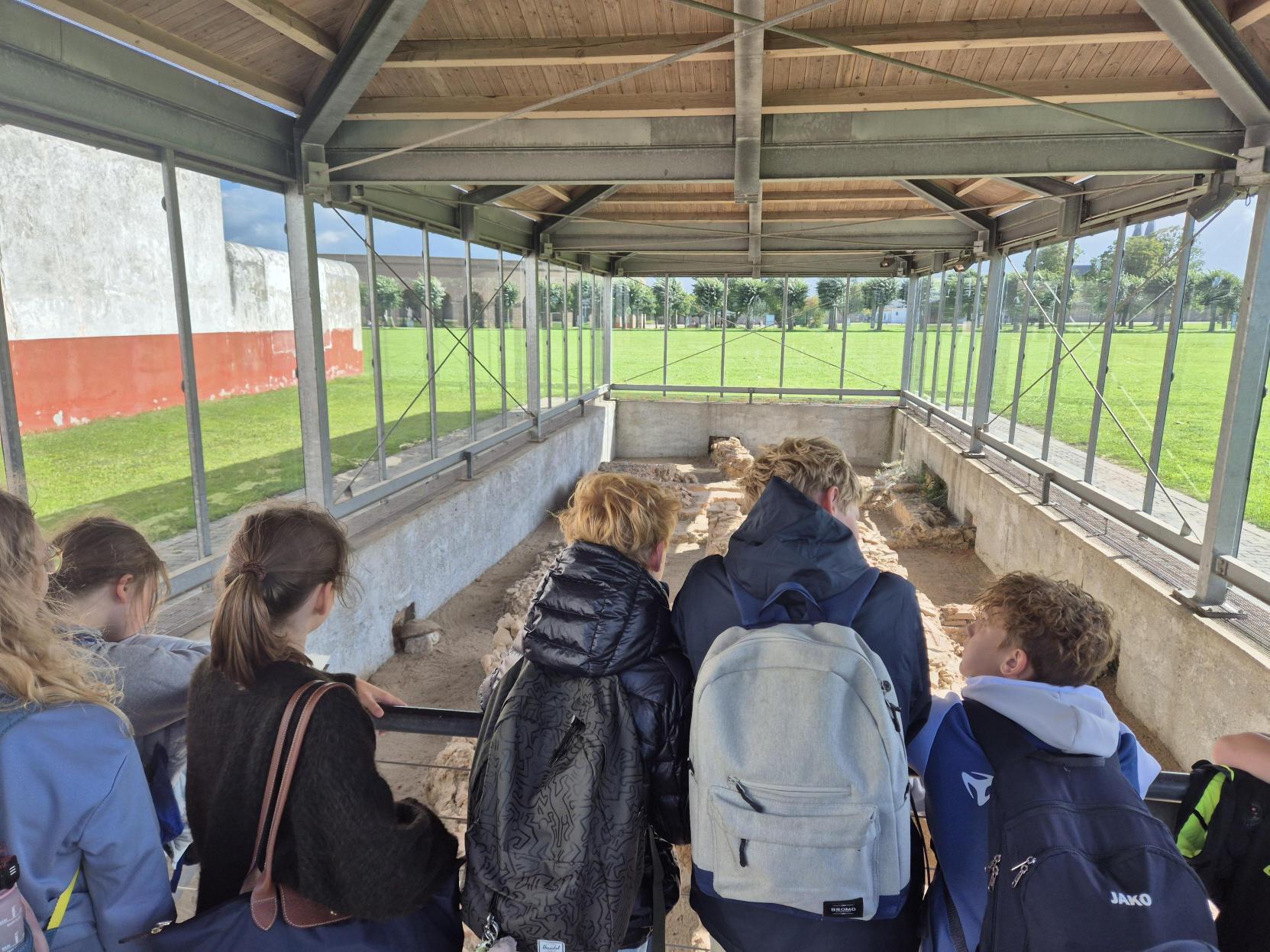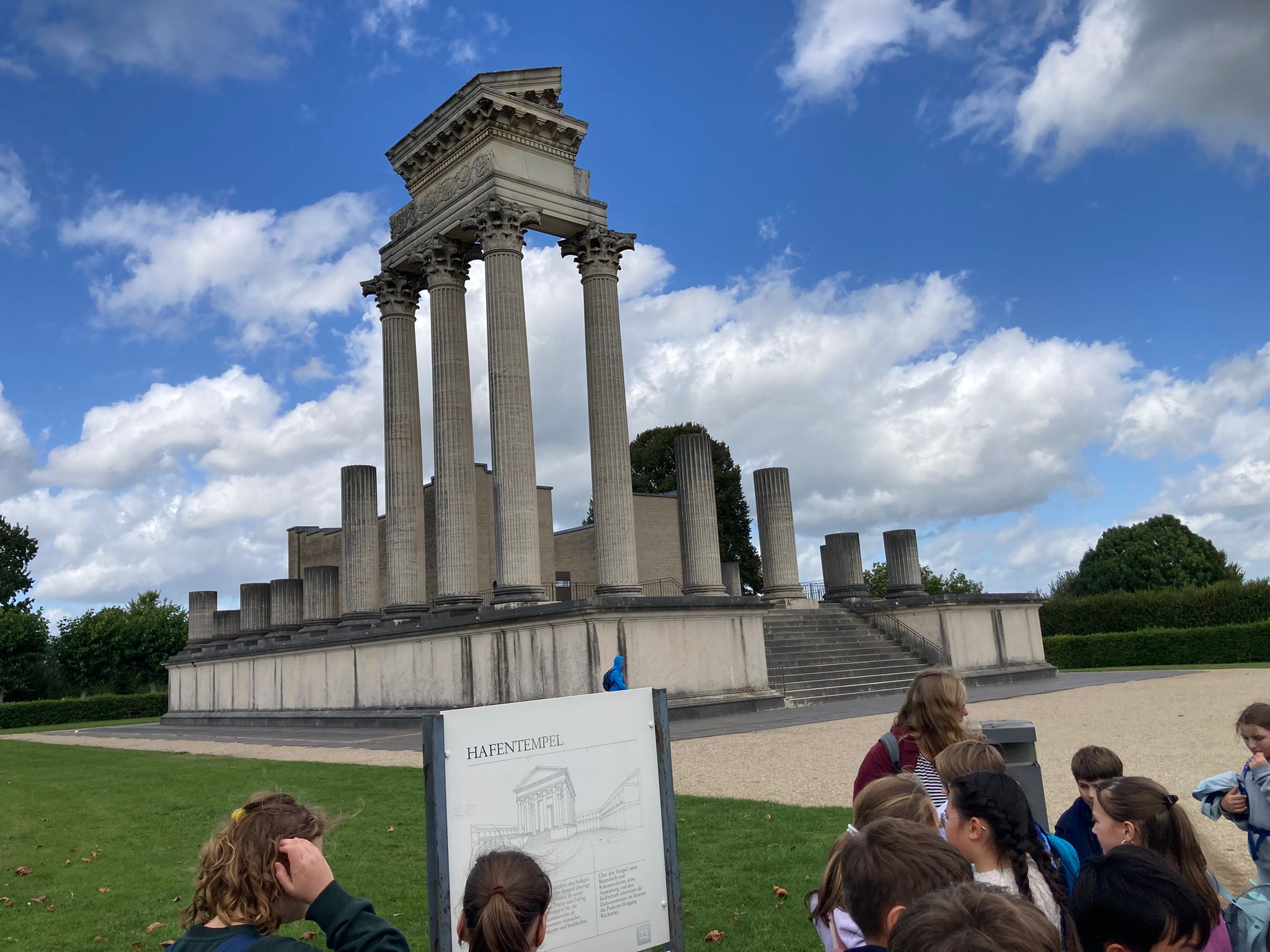 Im Anschluss hatten wir Gelegenheit, den gesamten Park zu erkunden. Zwischen den Stadtmauern und -toren, dem teilrekonstruierten Hafentempel und dem Amphitheater konnten wir uns ein lebendiges Bild von der Größe und Bedeutung der römischen Stadt machen. Besonders interessant war für viele Schülerinnen und Schüler der Blick in die Thermen, die ebenfalls Thema zuvor beim Römertag am Rats waren. Sie nutzten die Gelegenheit, Fragen zu stellen, eigenes Vorwissen einzubringen und die historische Atmosphäre auf sich wirken zu lassen.